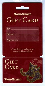 World Market Gift Card : Buy World Market Gift Cards Giftcardgranny. Check spelling or type a new query. We did not find results for: Cost plus world market is an american chain of specialty/import retail stores, selling home furniture, decor, curtains, rugs, gifts, apparel. Maybe you would like to learn more about one of these?